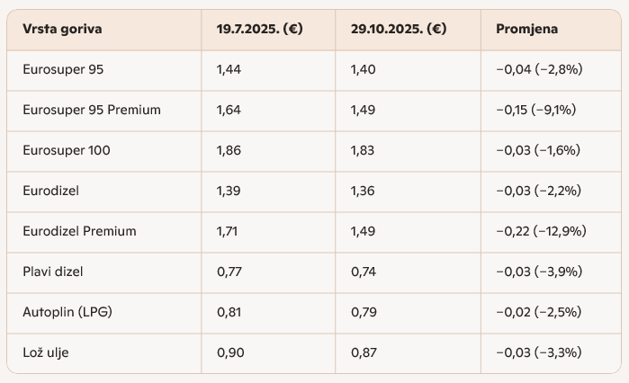Najveći pad zabilježen je kod premium goriva. Eurosuper 95 Premium je u tri mjeseca pojeftinio za 15 centi, dok je Eurodizel Premium s prosječnih 1,71 € pao na 1,49 € po litri – čak 13 posto manje. To upućuje na pojačanu tržišnu utakmicu među vodećim distributerima poput Ine, Lukoila, Petrola, Shella i Tifona.