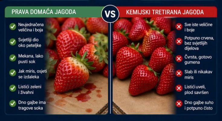 Razlika između domaćih i uvoznih jagoda najlakše se prepoznaje po mirisu, mekoći i tragovima soka. Savršeno crvene, tvrde i identične jagode možda izgledaju privlačno, ali često su daleko od svježine koju kupci očekuju.