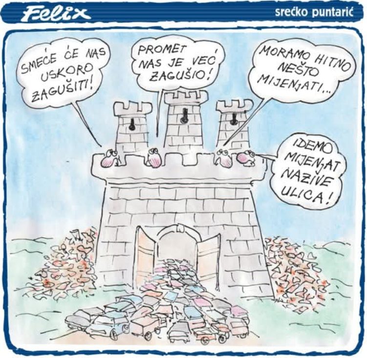 I dok se grad, kako crta Felix, guši u loše reguliranom prometu, tema promjene naziva ulica je od “životne važnosti”, napose za sve one koji od plaće žive do dvadesetog u mjesecu, a poslije posuđuju, zadužuju se ili peglaju minuse na karticama.