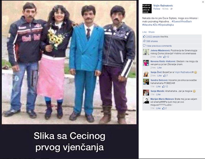 Vojin je na Facebook profilu objavio davno snimljenu Cecinu fotografiju uz komentar: “Slika s Cecinog prvog vjenčanja”. U opisu fotografije je dodao: ”Nekada davno prije Duce Šiptara, moga oca Arkana i malo poznatog Hajrudina”, napisao je Vojin i tagirao #maćeha i #zlo.