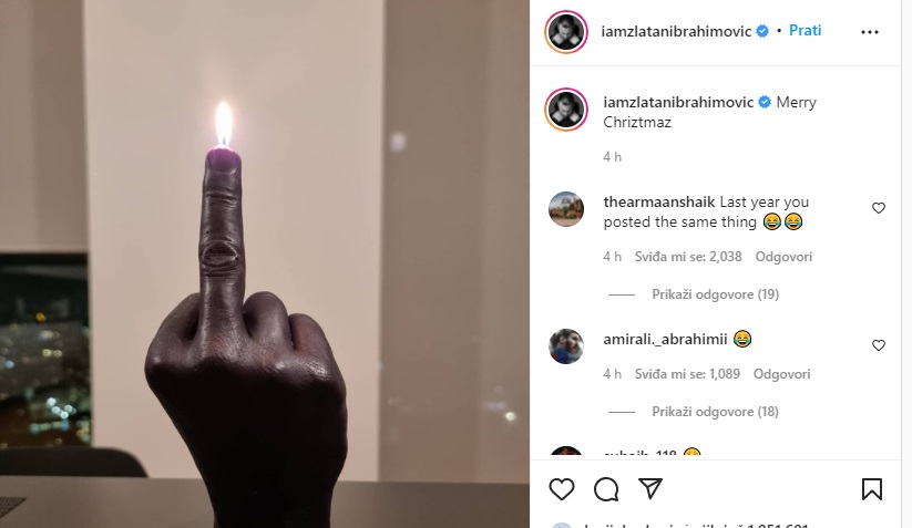 Zlatan Ibrahimović opet čestitao Božić na neprimjeren način. Svojim fanovima opet je pokazao srednji prst. Time je nastavio “tradiciju”, ali je pri tom uspio razbjesniti dobar dio navijač
