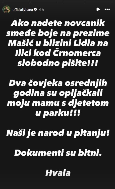 “Ako nađete novčanik smeđe boje na prezime Mašić u blizini Lidla na Ilici kod Črnomerca, slobodno pišite! Dva čovjeka srednjih godina opljačkala su moju mamu s djetetom u parku! Naš je narod u pitanju! Dokumenti su bitni. Hvala”, napisala je Hana i zamolila za pomoć.