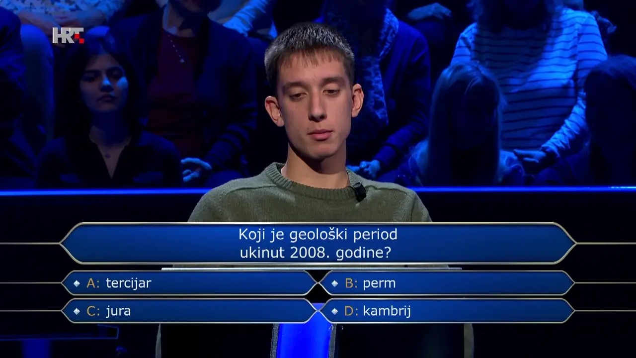 Na 13. pitanju, iako nije bio siguran u odgovor, Đuro je, kako je sam rekao, “opijen svime time”, odlučio riskirati i nastaviti igru. Pitanje za 34.000 eura glasilo je: Koji je geološki period ukinut 2008. godine? U ponudi su bili tercijar, perm, jura i kambrij.