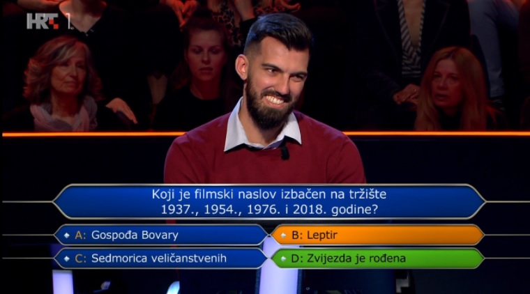 “Koji je filmski naslov izbačen na tržište 1937., 1954., 1976. i 2018. godine?” glasilo je pitanje za 16 tisuća kuna na koje su ponuđeni odgovori bili Gospođa Bovary, Leptir, Sedmorica veličanstvenih i Zvijezda je rođena.