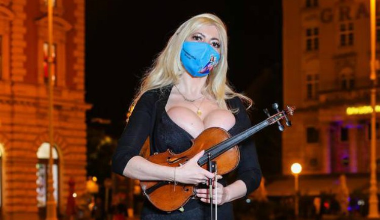 Atraktivna glazbenica bujnog poprsja privukla je pažnju prolaznika na Trgu bana Jelačića. S njom je bio i suprug Roman Brnada. “Odsvirala sam to da nas Bog štiti i ozdravi od korone”, rekla je.