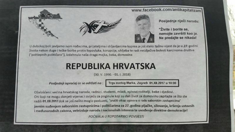 ”U dubokoj boli javljamo svim rođacima, prijateljima i državljanima, kojima je još stalo: tužnu vijest da je u 27. godini života nakon duge i teške borbe protiv lopovluka, korupcije, uhljeba te radi neizlječive bolesti karcinoma društva (‘pohlepnih političara’), izdahnula naša draga, majka, baka, domovina Republika Hrvatska (30.5.1990. do 01.1.2018.) Posljednji ispraćaj će se održati na Trgu svetog Marka, Zagreb 01.12.2017. u 10 sati.