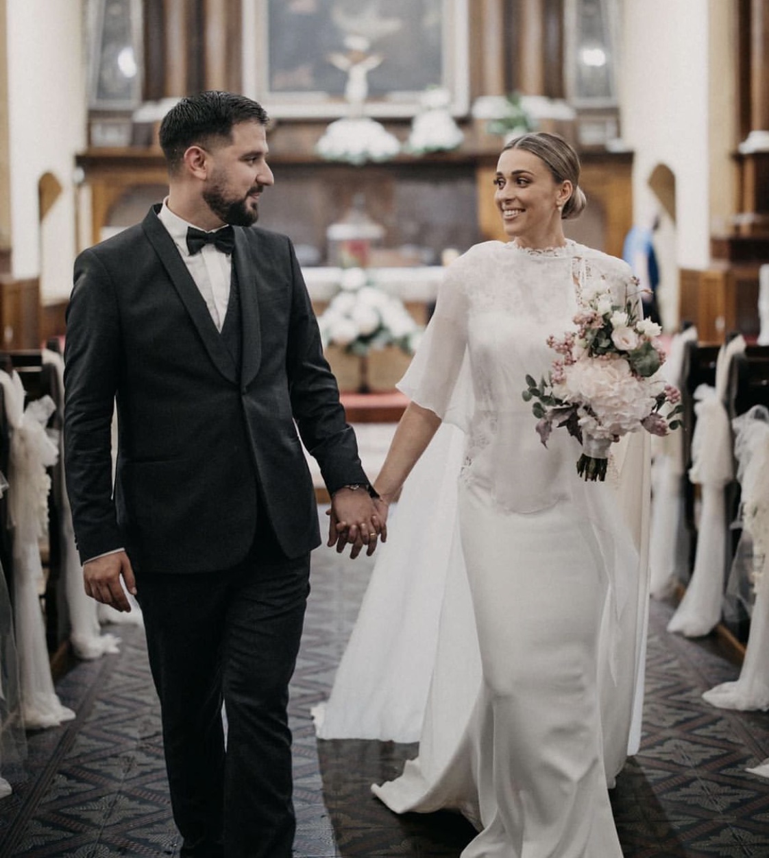 Toni je nosio crni smoking, bijelu košulju i crnu leptir mašnu, dok je mladenka imala dugu bijelu vjenčanicu s potpisom dizajnerice Aleksandre Dojčinović.