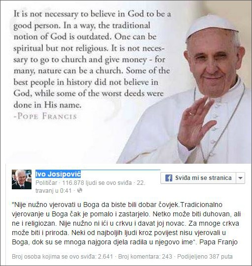 Bivši predsjednik Ivo Josipović na svom Facebook profilu objavio je citat koji se lažno pripisuje sv. ocu papi Franji. Taj citat klasični je internetska prevara koja već dulje vrijeme kruži društvenim mrežama, a sada je na nju nasjeo i Ivo Josipović koji, sudeći prema prvom licu jednine koje koristi na Facebooku, osobno održava svoj profil.