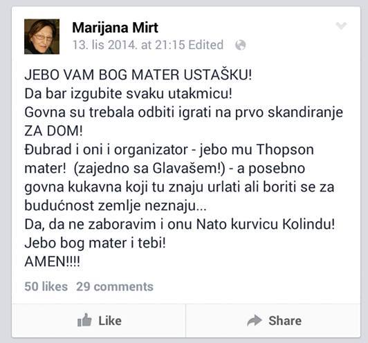 Uvredljiv tekstić izravna je reakcija je na koncert Mraka Perkovića Thompsona, održanog u Osijeku 8. listopada na Dan neovisnosti, i utakmicu Hrvatske nogometne reprezentacije protiv Azerbajdžana. Napisan je nekoliko sati nakon što su Vatreni pobijedili Azerbajdžan 6:0. Dok se Hrvatska radovala Marijana Mirt je bjesnila.