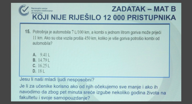 Ravnateljica NCVVO-a Maja Jukić izdvojila je i jedan zadatak, želeći istaknuti razinu neznanja iz matematike, a kako je istaknuto, zadatak nije znalo riješiti 12.000 pristupnika niže razine, piše srednja.hr.
