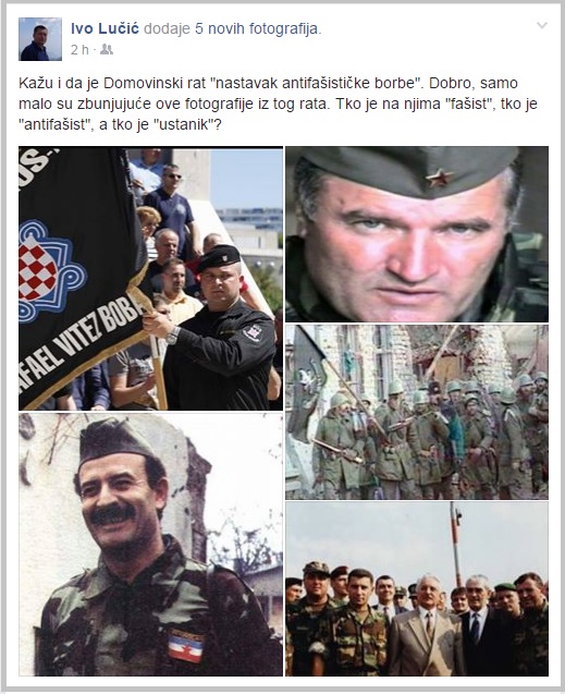 “Kažu i da je Domovinski rat “nastavak antifašističke borbe”. Dobro, samo malo su zbunjujuće ove fotografije iz tog rata. Tko je na njima “fašist”, tko je “antifašist”, a tko je “ustanik”?”, napisao je Lučić.