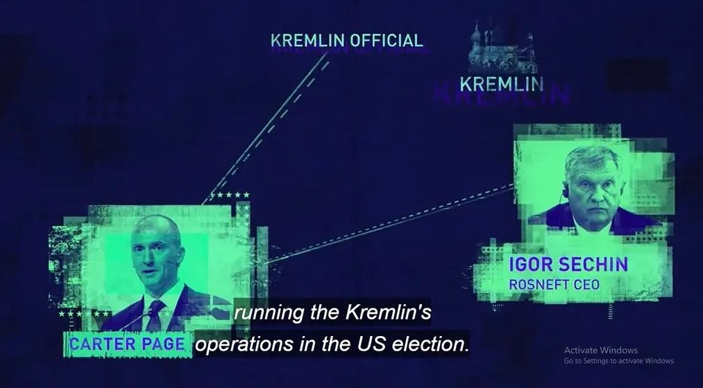 Na slici kadar iz filma u kojem se raspliće mreža ruskog utjecaja, od Sečina do tadašnjeg Trumpovog savjetnika za vanjske poslove Cartera Pagea. Slično je aranžiran kao i Sečinov posjet Milanoviću u pratnji rodijaka Ž. Runje 2013.