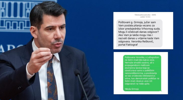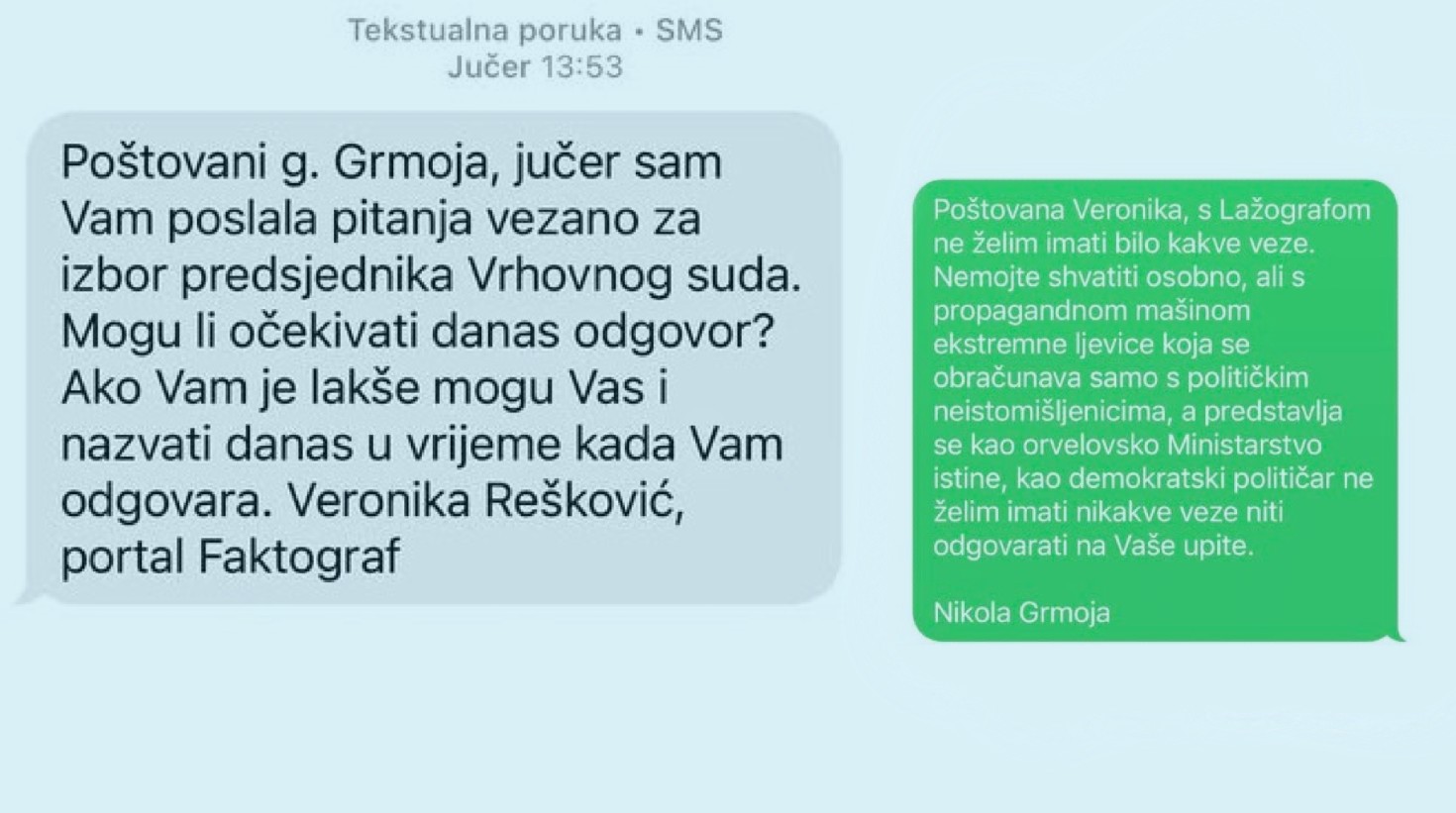 Pitanje novinarke: “Poštovani g. Grmoja, jučer sam Vam poslala pitanja vezano za izbor predsjednika Vrhovnog suda. Mogu li očekivati danas odgovor? Ako Vam je lakše mogu Vas i nazvati danas u vrijeme kada Vam odgovara. Veronika Rešković, portal Faktograf”