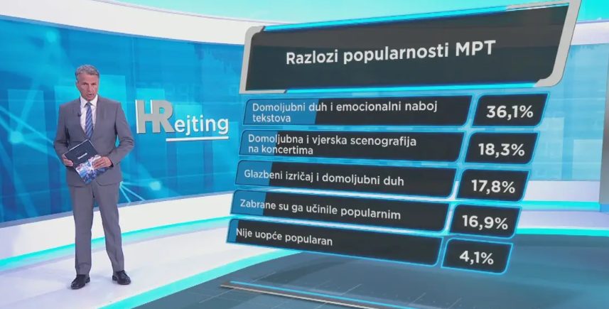 Trideset i šest posto odgovorilo je da je to zbog njegova domoljubnog duha i emocionalnog naboja tekstova. Osamnaest posto da je razlog tomu domoljubna i vjerska scenografija na njegovim koncertima. Sličan postotak drži da su to njegov glazbeni izričaj i domoljubni duh.