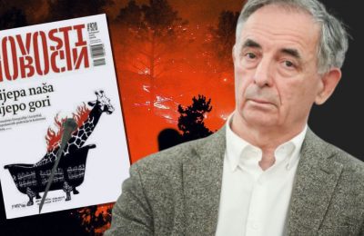 “Uboge vještice – Dalija Orešković, Vlatka Pokos i Severina Vučković napadaju Zlatka Dalića da zastavom ogrće stražnjicu, a one u svome svijetu hrvatsku zastavu vade iz vagine i pjevaju iz sveg glasa Pljuni i zapjevaj moja Jugoslavijo“, piše još na naslovnici tjednika.