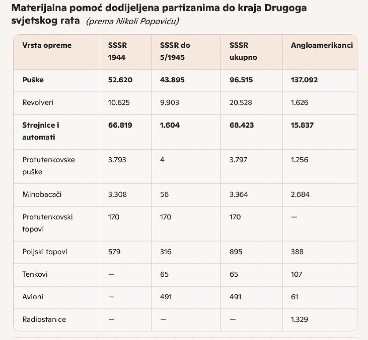 Valja napomenuti i da su tablične vrijednosti približne, jer su poslije objavljeni i neki drugi podatci, primjerice prema sovjetskim izvorima partizanima je do 1. svibnja 1945. predano 125 446 pušaka i karabina. Uz naoružanje i streljivo dodijeljena je i ogromna količina druge opreme, hrane, goriva i maziva bez kojih narasla Titova armija nije mogla funkcionirati.