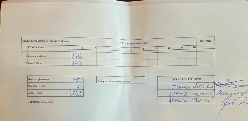 Dragi prijatelji, hvala vam na strpljenju, svima vam zahvaljujem bez obzira kako ste glasovali. Hvala vam što ste bili demokratični. Možda će to biti preuzetno reći, ali ne poznajem nijednu drugu zajednicu s ovakvim vrlinama. Vjerujem da će tako i ostati. Vjerujte u mene s 50 posto vjere kojom ja vjerujem u vas – i meni će to biti dovoljno, kazao je u govoru novi predsjednik Zajednice utemeljitelja HDZ-a Mario Kapulica.