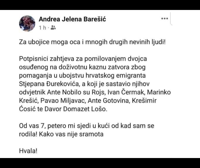 Andrea Jelena Barešić, kći glasovitog hrvatskog emigranta Mire Barešića, komentirala je molbu za pomilovanje Josipa Perkovića i Zdravka Mustača, osuđenih za organizaciji ubojstva hrvatskog emigranta Stjepana Đurekovića