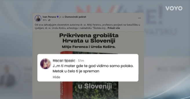 Prijeteća poruka glasi: “J…m ti mater gde te god vidimo samo polako. Metak u čelo ti je spreman.” Poruka je objavljena nakon što je Penava najavio promociju knjige “Prikrivena grobišta Hrvata u Sloveniji”, o partizanskim zločinima iz ljeta 1945. godine.