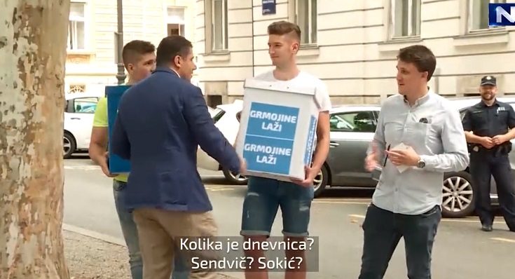 Nikola Grmoja održao je danas pred Ministarstvom vanjskih i europskih poslova konferenciju za medije o zviždaču Damiru Sabljaku. Presicu je pokušala omesti skupina prosvjednika iz Mladeži HDZ-a. Nosili su kutije s “Grmojinim lažima”, a Grmoja ih je nazvao sendvičarima.
