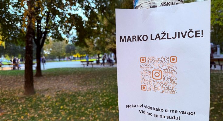 Na stupu u parku zalijepljen je plakat s velikim natpisom “Marko lažljivče! Nek svi vide kako si me varao! Vidimo se na sudu!”.