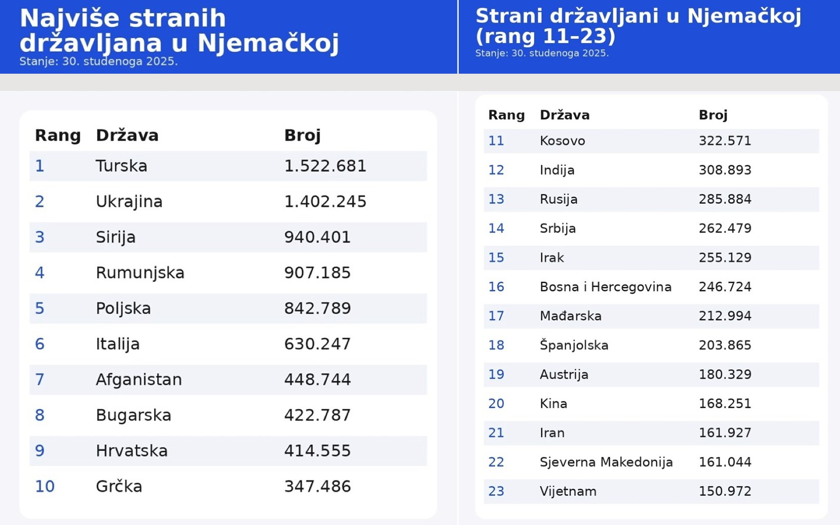 Prema podacima Središnjeg registra stranaca (AZR) sa stanjem na dan 30. studenog 2025., u Njemačkoj je registrirano 1,52 milijuna turskih državljana i više od 1,4 milijuna Ukrajinaca, piše FOCUS.