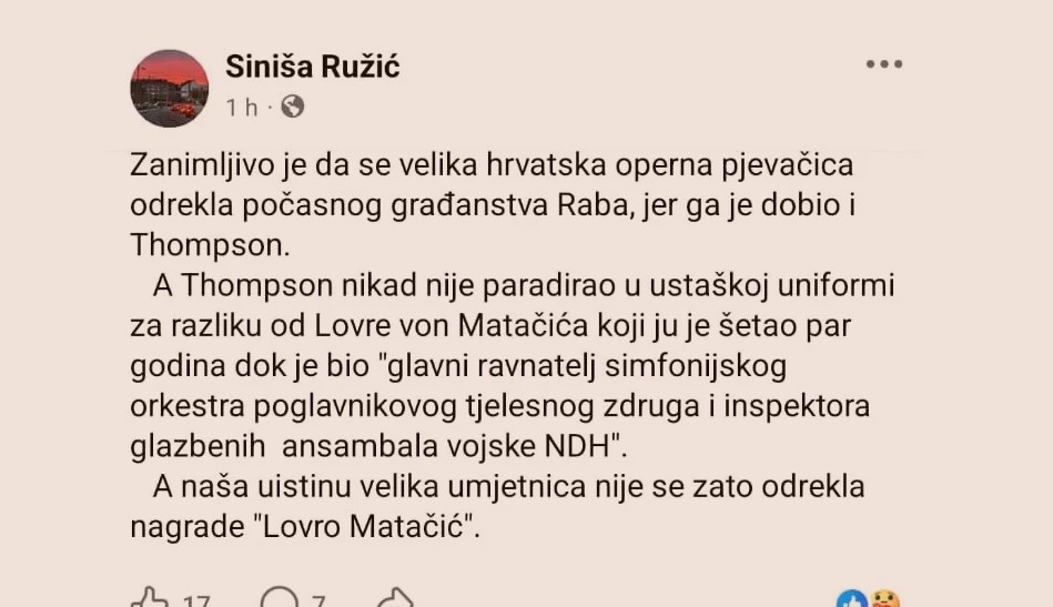 Ružić je poručio da je zanimljivo to što se operna pjevačica odrekla počasne titule jer ju je dobio Thompson pošto pjevač “nikada nije paradirao u ustaškoj uniformi za razliku od Lovre von Matačića koji ju je šetao par godina dok je bio glavni ravnatelj simfonijskog orkestra poglavnikovog tjelesnog zdruga i inspektora glazbenih ansambala vojske NDH”.