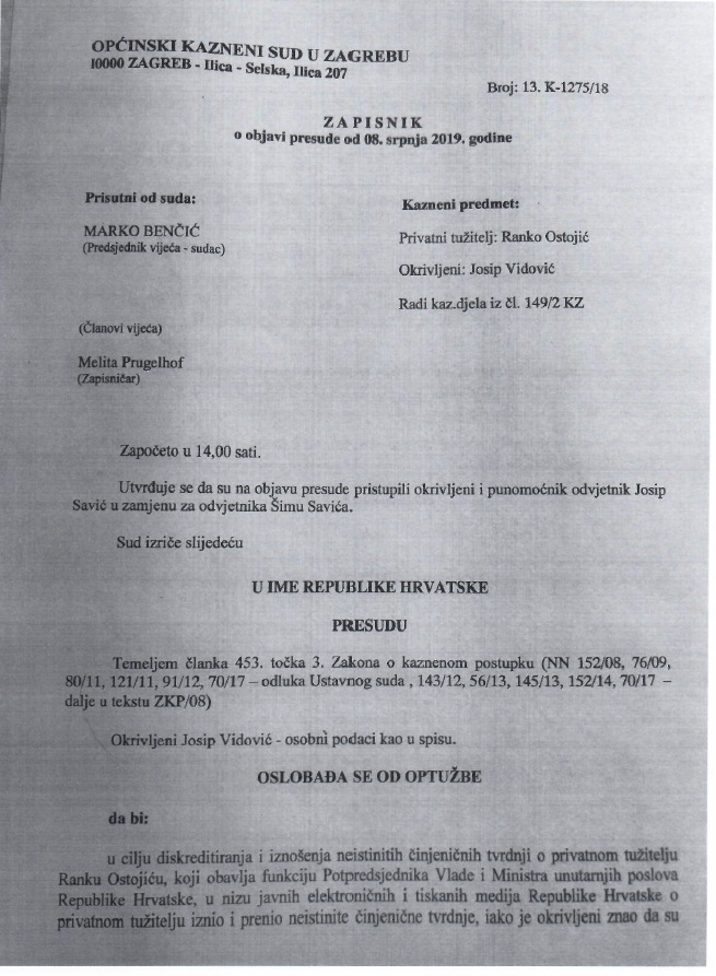 Općinski kazneni sud u Zagrebu, pod predsjedanjem suca Marka Benčića 8. srpnja 2019 presudio je da je Josip Vidović oslobađa optužbe.