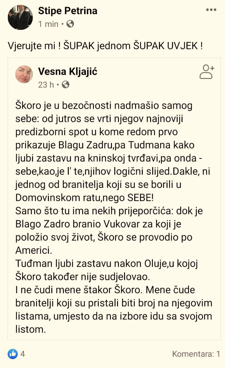 Zanimljiv komentar o Miroslavu Škori jučer je objavila novinarka Vesna Kljajić, navodeći da je “nadmašio samog sebe i u predizborni video s Blagom Zadrom i Tuđmanom ubacio sebe”.
