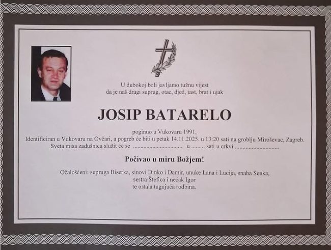 U petak u 14. studenog u 13:20 sati na zagrebačkom groblju Miroševac bit će posljednji ispraćaj Josipa Batarela. Josip je Vukovarac, hrvatski ratnik, a obitelj je porijeklom iz Krušvara kraj Dicma u Splitsko-dalmatinskoj županiji.