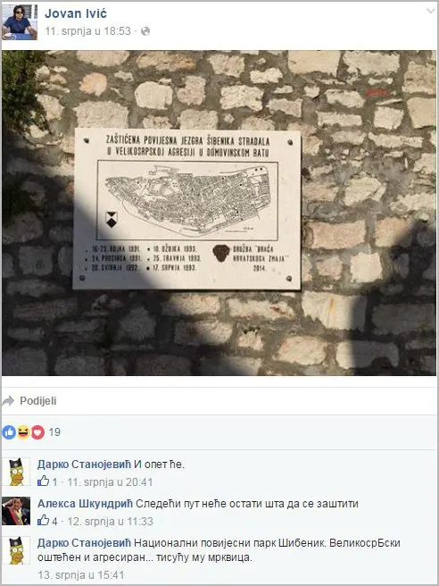 U drugoj objavi stavio je fotografiju zaštićene povijesne jezgre grada Šibenika stradale u velikosrpskoj agresiji u Domovinskom ratu. “I opet će”, komentirao mu je jedan prijatelj, a drugi dodao: “Sledeći put neće imati šta da se zaštiti.”