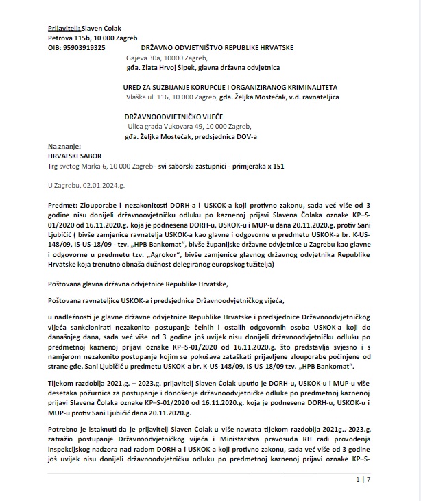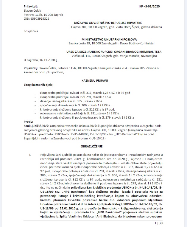 U ovom serijalu objavljujemo kaznenu prijavu Slavena Čolaka oznake KP–S-01/2020 od 16.11.2020.g. koja je podnesena DORH-u, USKOK-u i MUP-u dana 20.11.2020. protiv Sani Ljubičić, a po kojoj kaznenoj prijavi protivno zakonu, sada već više od 3,5 godine nije donesena državnoodvjetnička odluka.