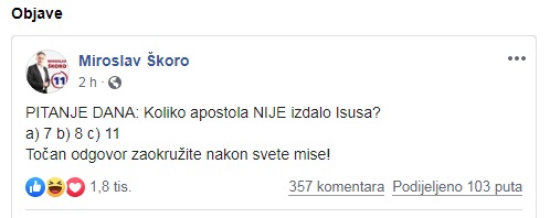 Škoro je na Facebooku objavio “PITANJE DANA” čiji odgovor daje njegov broj na glasačkom listiću. Pitanje glasi “Koliko apostola NIJE izdalo Isusa?”