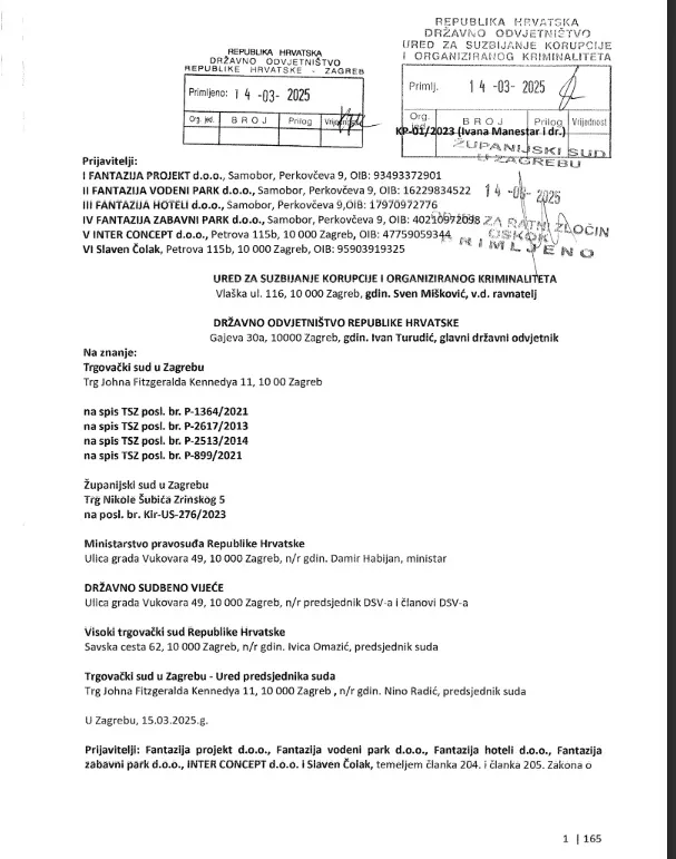 Kaznena prijava Fantazija projekt d.o.o., Fantazija zabavni park d.o.o., Fantazija vodeni park d.o.o. i dr. protiv sutkinje Trgovačkog suda u Zagrebu Ivane Manestar i dr. podnesena DORH-u i USKOK-u dana 14.03.2025.