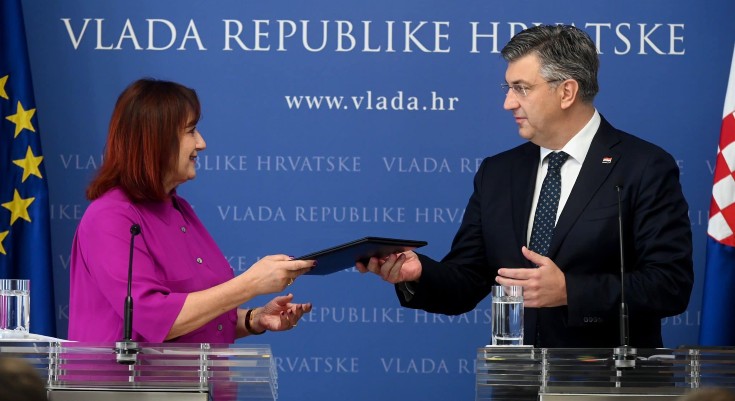 “Potpredsjednica European Commission Dubravka Šuica uručila je hrvatskom premijeru odluku o isplati 1. rate od 700 milijuna € bespovratnih EU sredstava za provedbu Nacionalnog plana oporavka i otpornost!