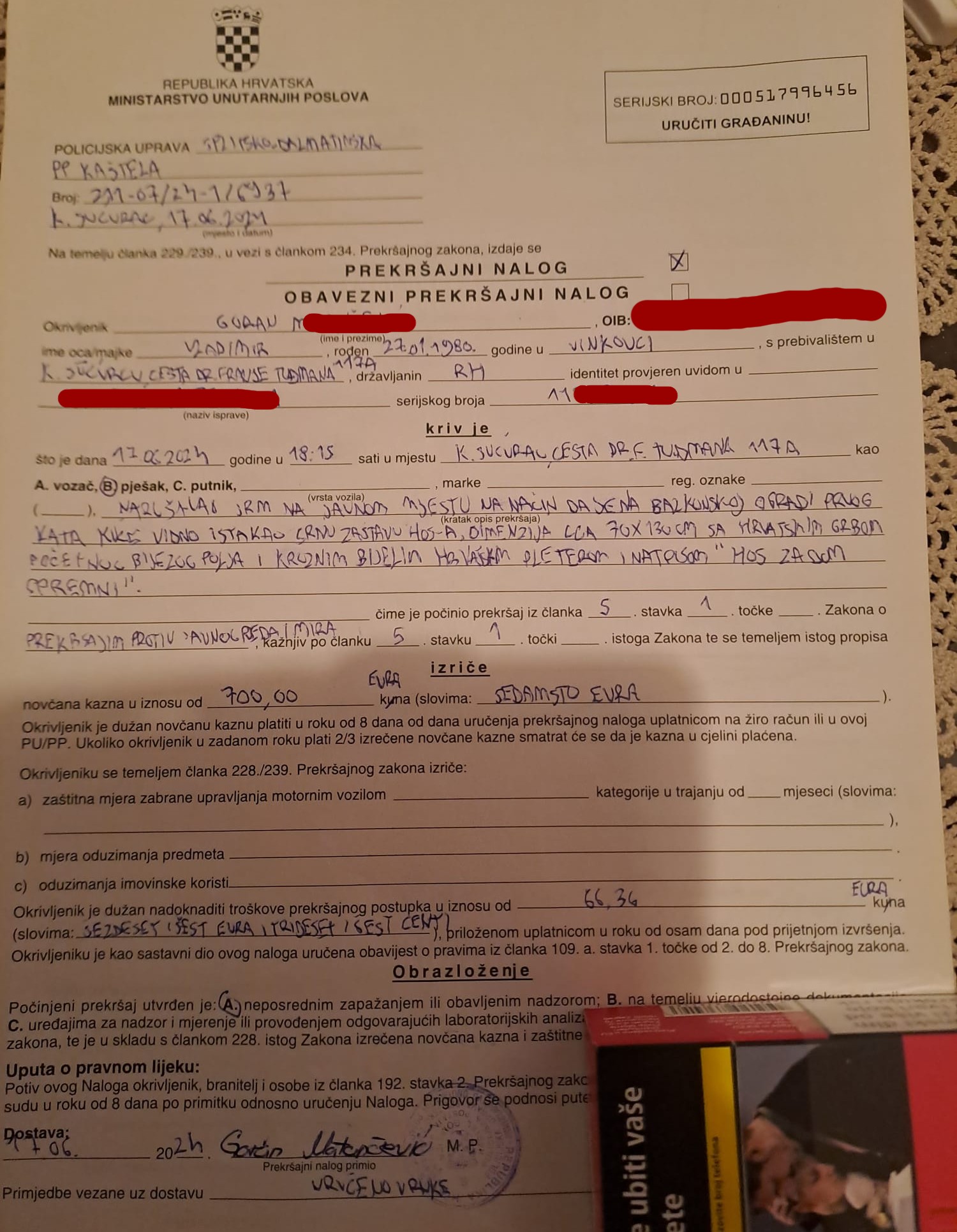 Na društvenim mrežama objavljen je preslik prekršajnog naloga Policijske postaje Kaštela na kojem se navodi da je ‘pješak’ u 18.15 narušio javni red i mir na način da je na balkonskoj ogradi prvog kata kuće vidno istaknuo crnu zastavu HOS-a.