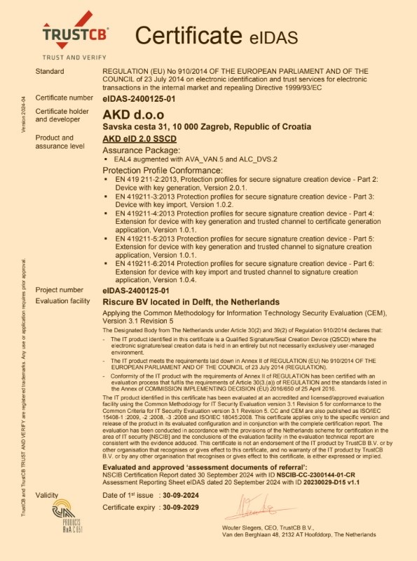 AKD je uspješno završio evaluaciju od strane nezavisnog akreditiranog laboratorija za svoj novi proizvod AKD eID Card v2.0. SSCD prema Common Criteria (CC) EAL4+ standardu.