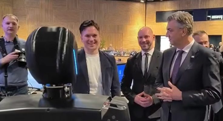 Premijer Andrej Plenković presjedao je sjednicom Nacionalnog vijeća za digitalnu transformaciju u Nacionalnoj i sveučilišnoj knjižnici, a prije njega ga je dočekao prvi hrvatski humanoidni robot iz Runovića kod Imotskog, RINNO.