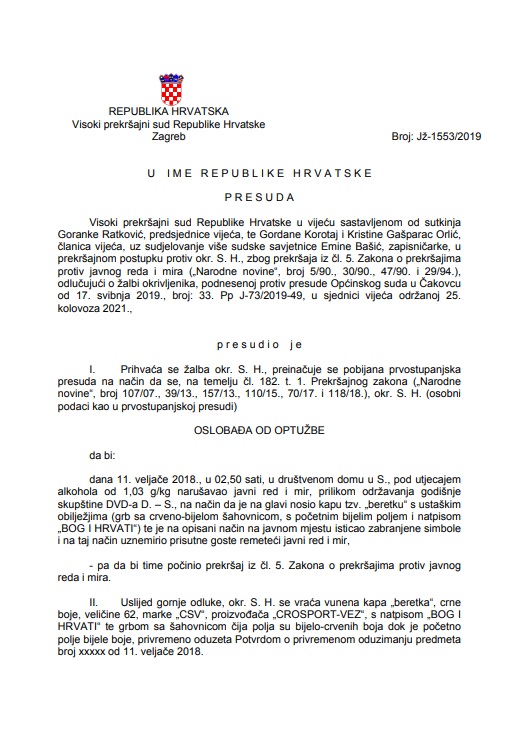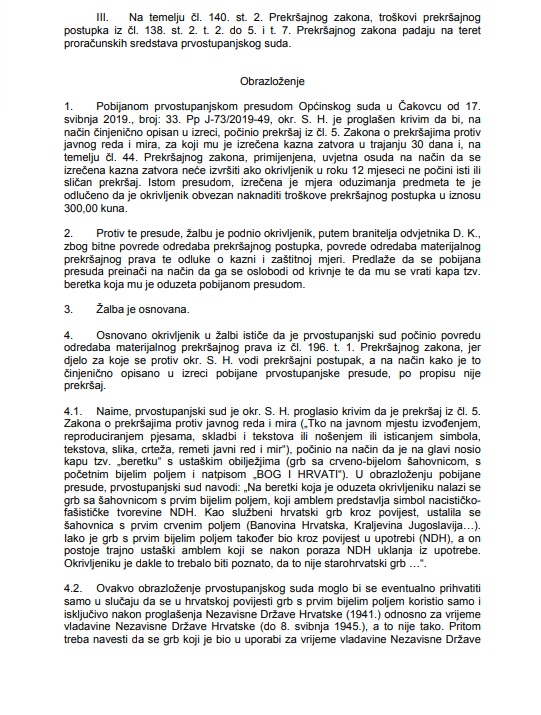 Krimen je taj što je, piše u prvostupanjskoj presudi, “na glavi nosio kapu tzv. beretku s ustaškim obilježjima (grb s crveno-bijelom šahovnicom, s početnim bijelim poljem i natpisom „BOG I HRVATI“) te je na opisani način na javnom mjestu isticao zabranjene simbole i tako uznemirio prisutne goste remeteći javni red i mir”.