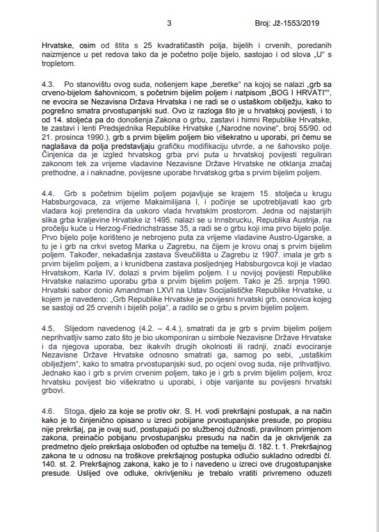 Slijedom navedenog, smatrati da je grb s prvim bijelim poljem neprihvatljiv samo zato što je bio ukomponiran u simbole Nezavisne Države Hrvatske i da njegova uporaba, bez ikakvih drugih okolnosti ili radnji, znači evociranje Nezavisne Države Hrvatske odnosno smatrati ga, samog po sebi, „ustaškim obilježjem“, kako to smatra prvostupanjski sud, po ocjeni ovog suda, nije prihvatljivo.
