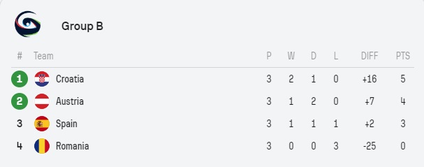 Tako će Hrvatska i Austrija put Koelna krenuti s jednim bodom, a tamo će im se sa po dva boda pridružiti Francuska kao pobjednik skupine A te Mađarska koja je s maksimalnih šest bodova osvojila prvo mjesto u skupini C.