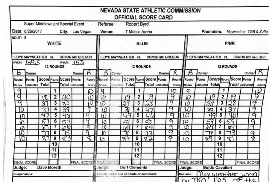 Amerikanac jee slavio tehničkim nokautom u 10. rundi, a i da je McGregor izdržao svih 12 rundi, teško bi na kraju slavio. Mayweather je u tom trenutku bio u velikoj bodovnoj prednosti.