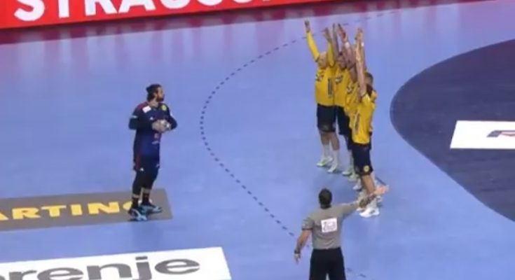 Francuzi su uspjeli doći do suparničkog deveterca, gdje im je s istekom vremena dosuđen slobodni udarac. Šveđani su postavili živi zid ispred Elohima Prandija, ali je Francuz uspio snažnim šutom poslati loptu između ruku švedskih igrača i pod gredu za izjednačenje na 27-27