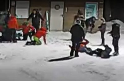 NAJBRUTALNIJI DIO: Član HGSS-a mirno sjedi na snijegu dobiva još jedan brutalan udarac nogom u glavu, nakon čega pada, a ljudi mu kreću pružati pomoć....