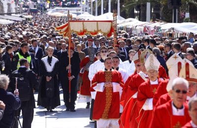 Blagdan je započeo budnicom Gradske glazbe Split, a s Peristila je u 10 sati krenula procesija prema Rivi gdje se služila svečana misa. Moći svetoga Dujma nosile...