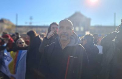 Ispod transparenta, na ogradi, jasno se vidi i velika slika četničkog vođe i ratnog zločinca Draže Mihailovića.