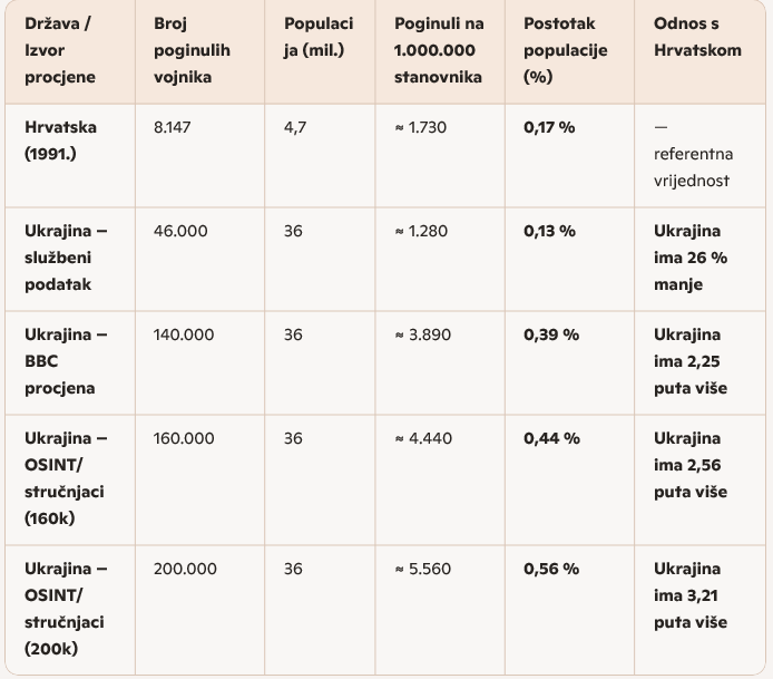 1) Službeni podatak (Zelenski, veljača 2025.) 46.000 poginulih ukrajinskih vojnika (deseci tisuća nestalih ili zarobljenih ne koristi se u ovoj usporedbi). Izračun po glavi stanovnika – 1.280 poginulih na milijun stanovnika, što je 0,74 u odnosu na Hrvatsku