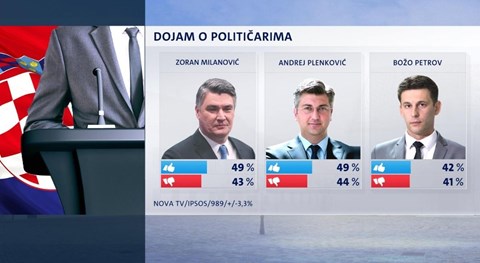 Predsjednik Milanović i dalje je najpopularniji političar i o njemu pozitivan dojam ima 49 posto, a negativan 43 posto ispitanika. U mjesec dana on je malo i popravio svoj rejting. Slično je i s premijerom Plenkovićem, o njemu pozitivan dojam ima 49 posto, a negativan njih 44 posto. Božo Petrov dijeli birače i o njemu 42 posto građana misli negativno, a njih 41 posto misli pozitivno.