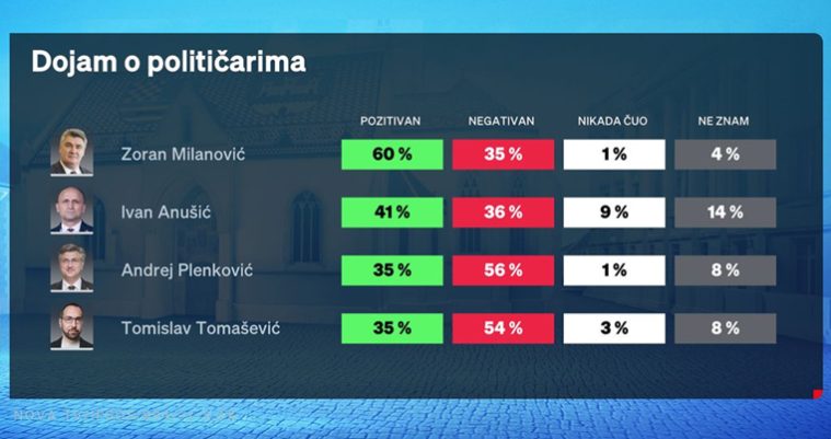 Na ljestvici popularnosti političara, predsjednik Zoran Milanović i dalje je na vrhu – pozitivan dojam ostavlja na 60 posto ispitanika. Slijedi ga ministar obrane Ivan Anušić s 41 posto. Treće mjesto s 35 posto podrške dijele premijer Andrej Plenković i zagrebački gradonačelnik Tomislav Tomašević.