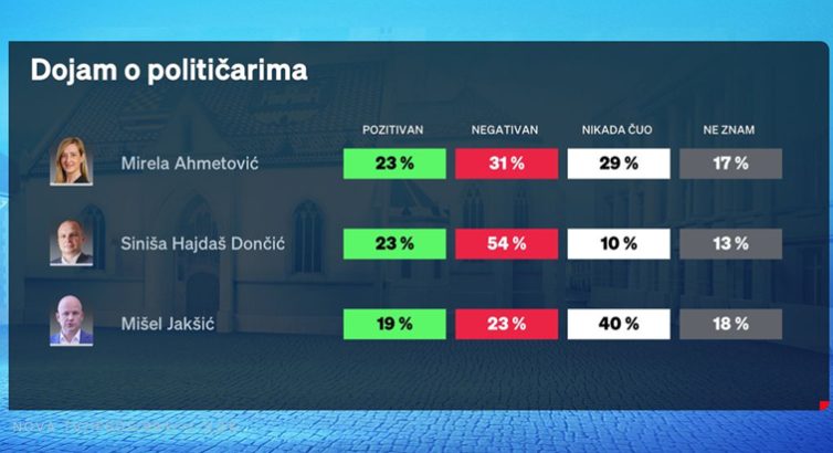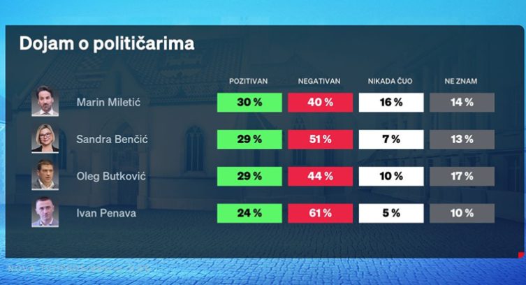 Kada je riječ o negativnom dojmu, na prvom mjestu je čelnik Domovinskog pokreta Ivan Penava, kojeg negativno ocjenjuje 61 posto građana.
